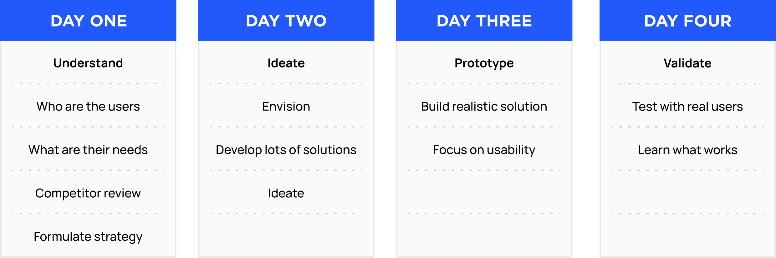 The sprint is a four-day process for answering critical business questions through design, prototyping, and testing ideas with customers.
